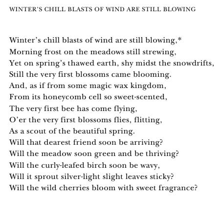 This translation is titled, “Winter’s chill blasts of wind are still blowing”, an excerpt from My Talisman, a collection of poems by Alexander Pushkin, translated by Julian Henry Lowenfeld. (The only other source I found is this more literal translation which also includes the original Russian, but I prefer this version.)